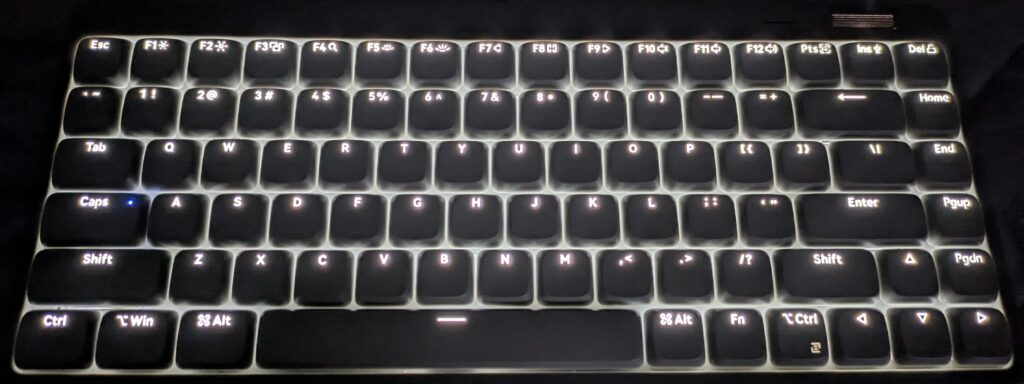 (暗闇で撮影)スイッチを静音性の高いVoidに変更済み。暗い部屋は勿論、一定のリズムでライトが付いたり消えたりする”ブリージングモード”であれば、明るい部屋でも視認性が高く使いやすいです。